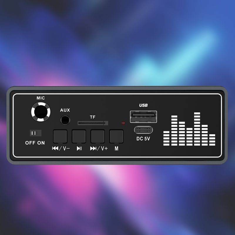 Dotato di connettività Bluetooth 5.4, consente di collegare facilmente smartphone, tablet e altri dispositivi compatibili per la riproduzione musicale senza fili. Supporta inoltre diverse modalità di utilizzo, tra cui TF, chiavetta USB, TWS e AUX, per garantire una maggiore flessibilità nelle sorgenti audio.