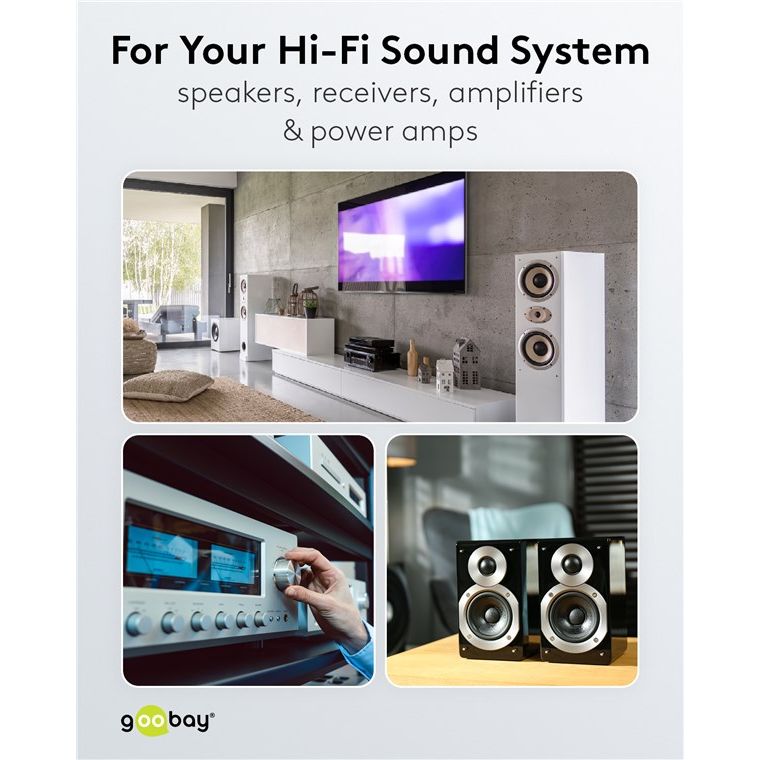 Goobay ha sempre gli accessori giusti per collegare l'elettronica di consumo come altoparlanti, amplificatori e sistemi audio. I nostri prodotti trasmettono i segnali audio con la massima qualità per un suono eccezionale. Le robuste guaine dei cavi e i conduttori interni di alta qualità dei nostri cavi per diffusori garantiscono un'esperienza di intrattenimento perfetta. Semplicemente. Tutto. Ciò che serve!