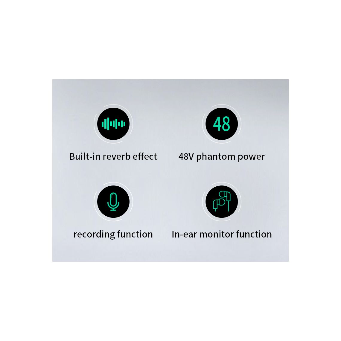 - Alimentazione phantom 48 V incorporata per microfoni a condensatore.