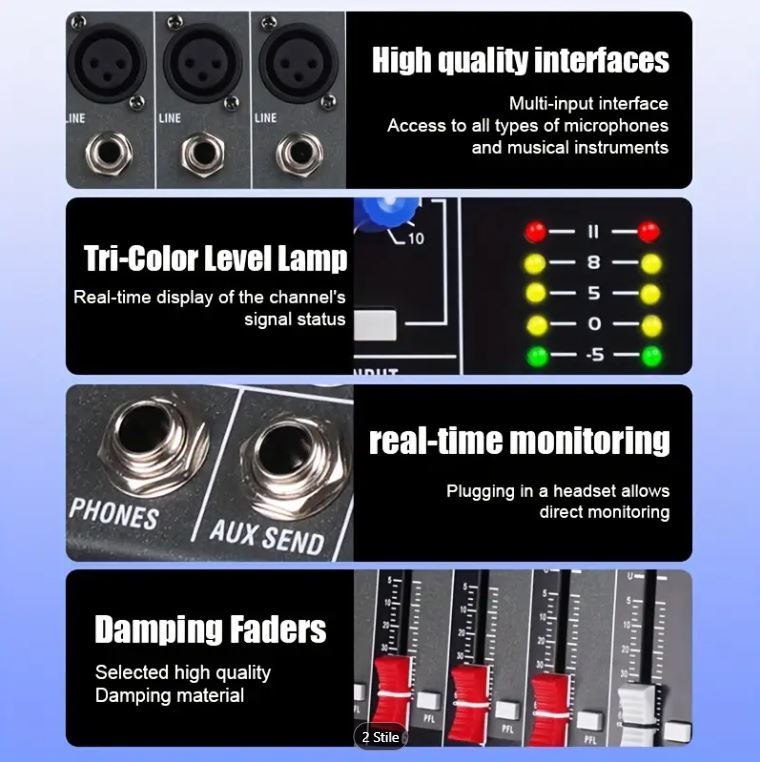 - Mixer analogico professionale a 6 canali con layout intuitivo