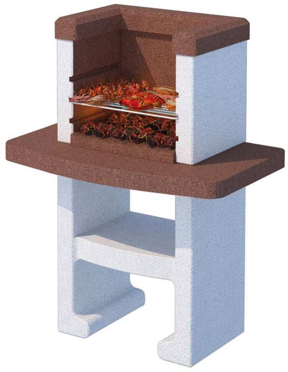 In cemento refrattario, piano di appoggio pigmentato all'origine, griglia cromata cm. 45x33 regolabile su tre altezze, utilizzabile a carbonella, da assemblare con malta e dipingere con colore al quarzo idrorepellente.