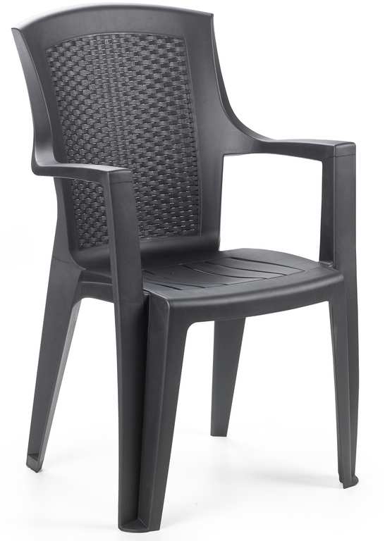 In polipropilene effetto rattan con film antigraffio, resistente e duratura, impilabile, schienale alto.