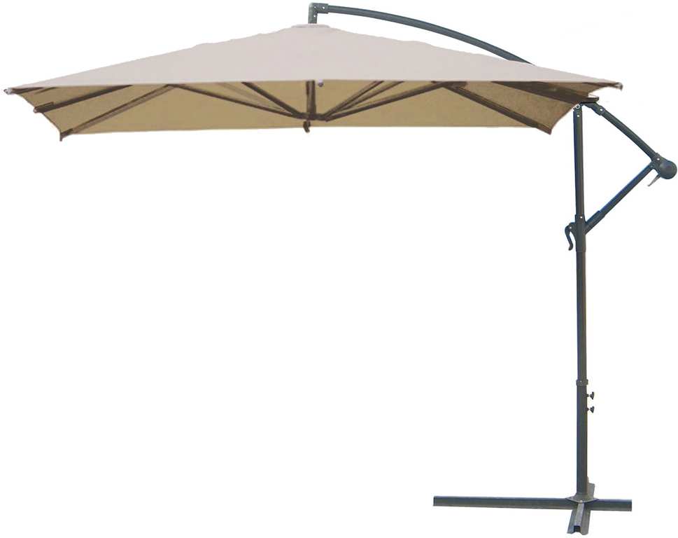 Struttura in acciaio, apertura/chiusura con manovella, stecche in acciaio, telo in poliestere, fessura antivento, base a croce, col. ecrù.