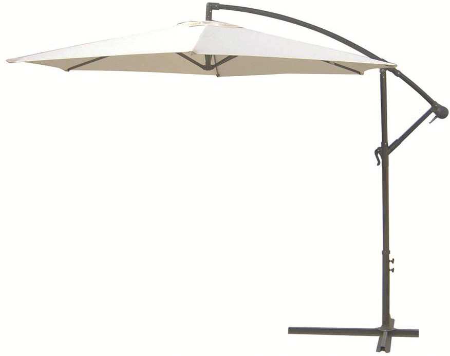 Struttura in acciaio, apertura/chiusura con manovella, stecche in acciaio, telo in poliestere, fessura antivento, base a croce, col. ecrù.