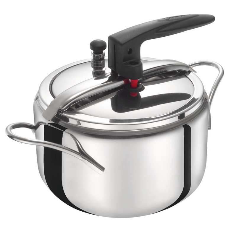 Corpo in acciaio inox 18/10 ad elevato spessore, fondo thermo radiant in triplo con alluminio, adatto per utilizzo su piani ad induzione, triplo sistema di controllo pressione, sistema di sicurezza SystemBlock.