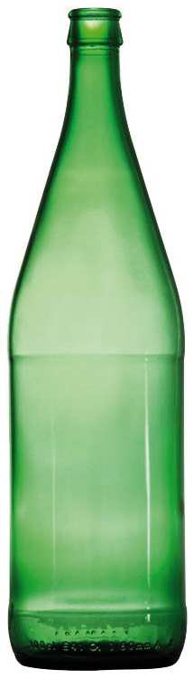 In vetro ideale per la conservazione di alimenti, specifica per la conservazione di acqua minerale, imboccatura per tappi a corona, senza tappo, col. verde.