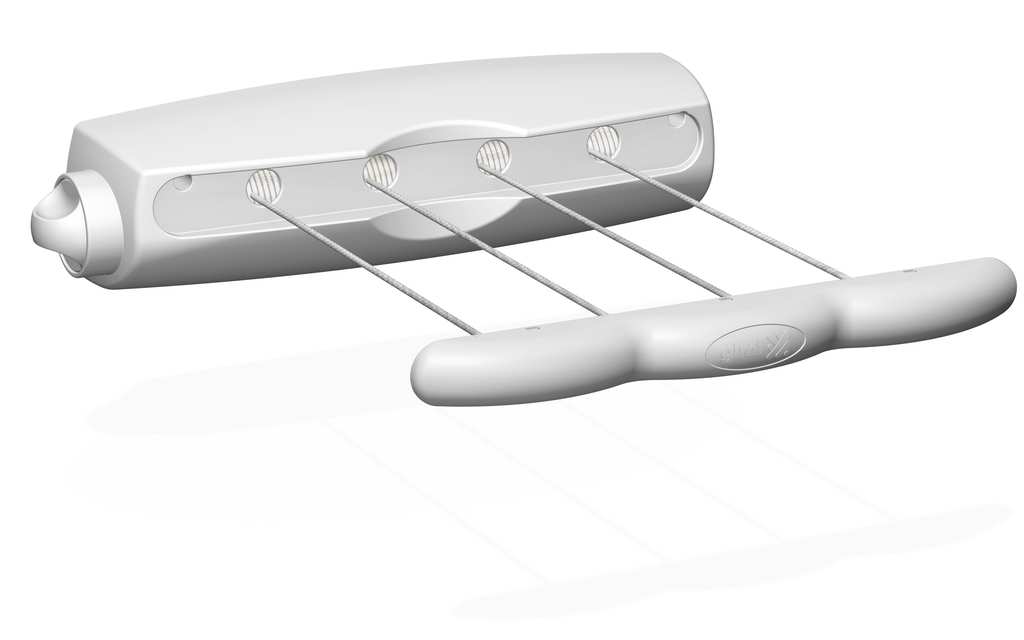 100% resina, fili retraibili automaticamente, sistema di bloccaggio sicuro e supporto di aggancio appenditutto. Stenditura 14 mt.