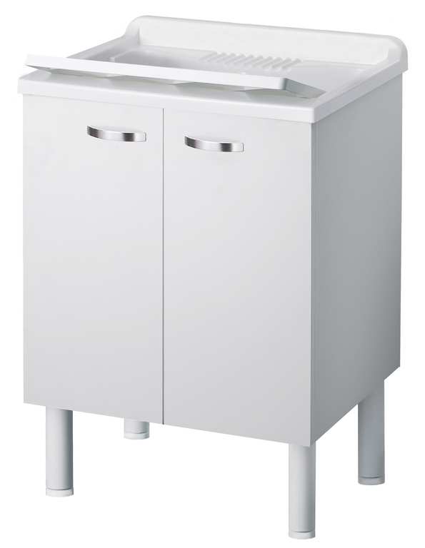 Struttura in legno. Vasca, asse, piletta e sifone in polipropilene resistente agli acidi. Maniglie cromate, piedini regolabili in altezza, già montato, col. bianco.