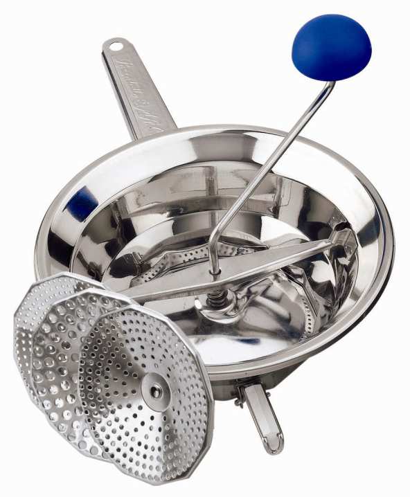 Corpo in acciaio inox 18/10, 3 filtri intercambiabili, 3 piedini pieghevoli. Ideale per passati di verdura.