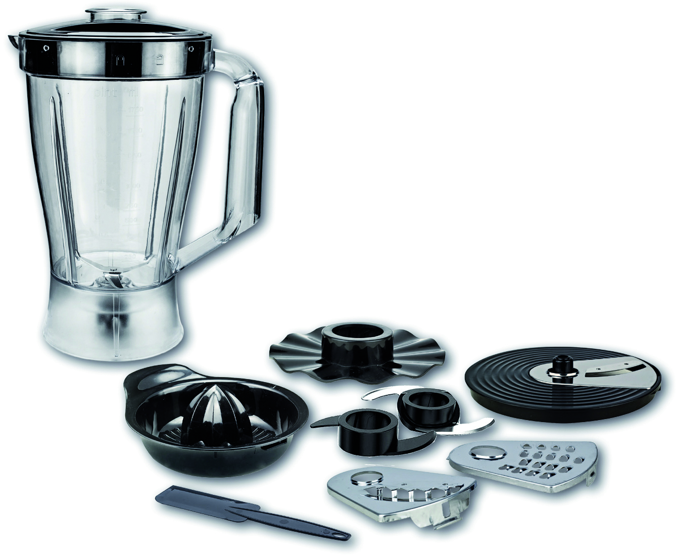 Multifunzione: frullatore, spremiagrumi, tritatutto, affettaverdure, emulsionatore. 2 velocità e funzione pulse, ciotola graduata lt. 2, chiusura di sicurezza, set completo di accessori, cm. 20x15x27 h.