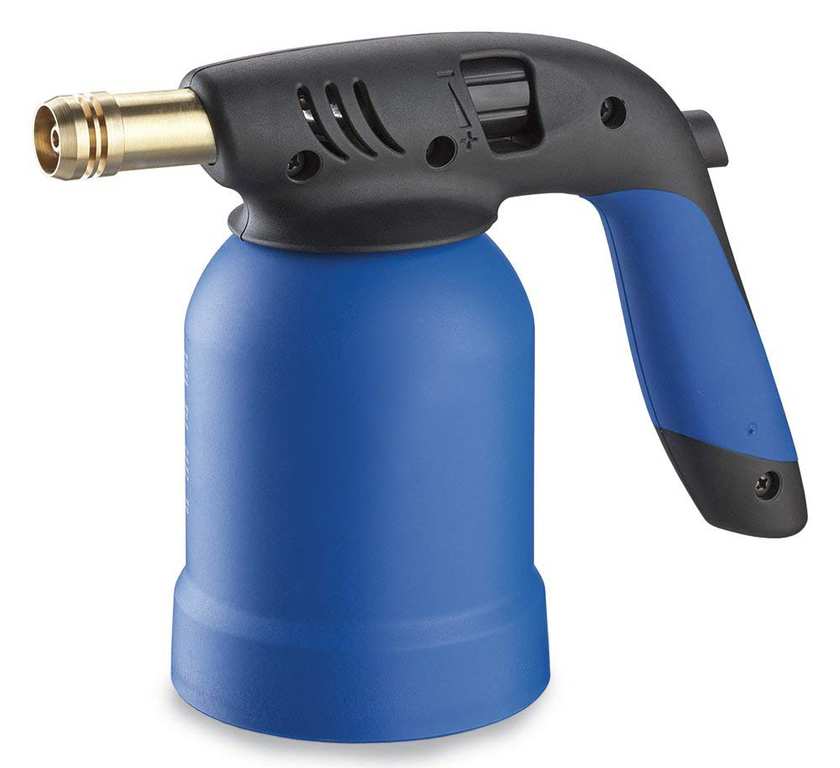 Base con sistema di sicurezza brevettato anti-sblocco cartuccia, impugnatura ergonomica gommata, fiamma a punta professionale, portacartuccia in plastica.