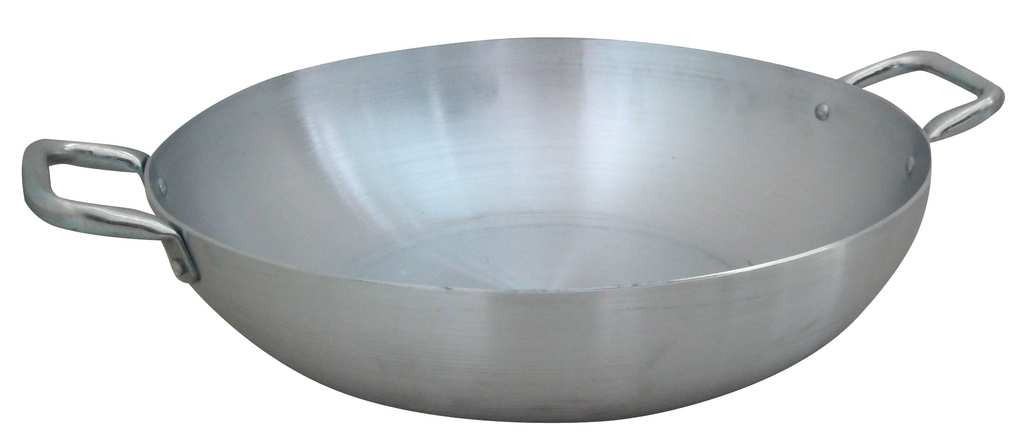 In alluminio puro 99.5%, fondo spesso, per uso professionale. A 2 manici, lavabile anche in lavastoviglie.
