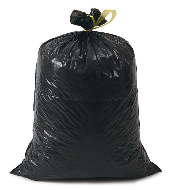Sacco in polietilene a bassa densità con laccio di chiusura. Con cucitura laterale, antigoccia, col. nero, rotolo da 15 sacchetti.