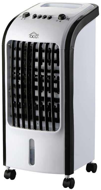 3 velocità, oscillazione automatica delle feritoie, raffresca attraverso levaporazione dellacqua, tanica acqua lt. 4, con rotelle e maniglia per il trasporto, 2 ghiacci sintetici inclusi, cm. 24x26x57 h.