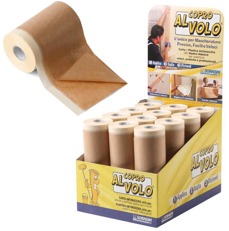 Carta antimacchia di pura cellulosa accoppiata con nastro adesivo. Per piccole coperture, battiscopa e bordi. Fornita in display da banco.