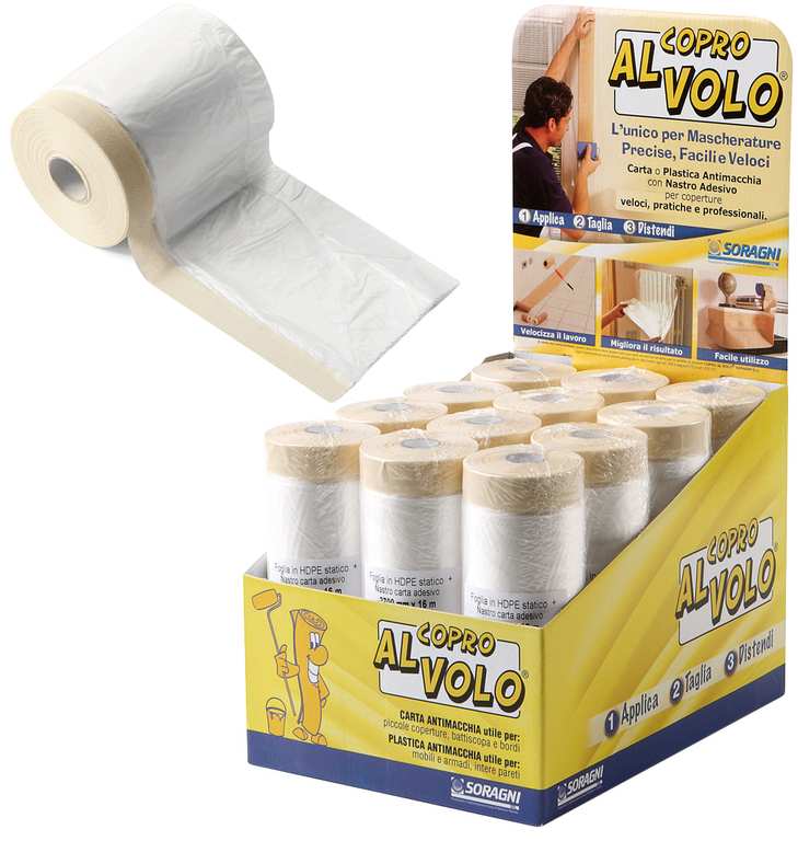 Bobina in HDPE antimacchia per vernici accoppiata con nastro adesivo. Per mobili, armadi, intere pareti, ecc. Fornita in display da banco.