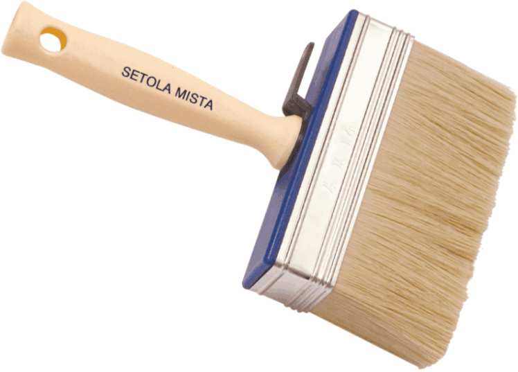 In misto setola bionda, ghiera in banda stagnata, assicella e manico in plastica.