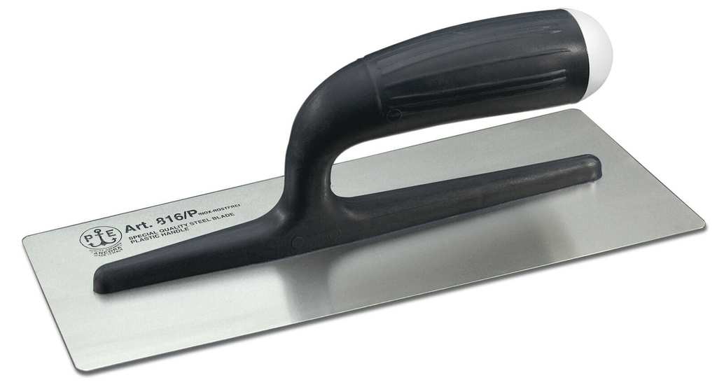 In acciaio inox, saldato, manico e supporto in plastica rinforzata, angoli arrotondati.