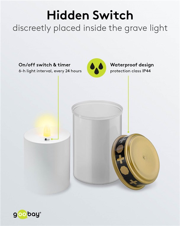 Il lumino per tomba è adatto all'uso interno ed esterno, grazie al grado di protezione IP44 e al vano batteria impermeabile all'interno della candela