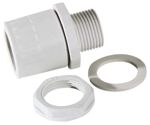 In tecnopolimero autoestinguente, passo metrico, con dado montato, elevata resistenza agli urti, grado di protezione IP65, col. grigio.