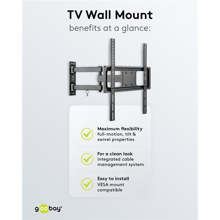 Il full-motion montaggio è adatta per la maggior parte da 32 a 55 pollici (81-140 cm) TV fino a 35 kg. La staffa fornisce angolo di inclinazione ottimale per una distanza parete di fino a 427 millimetri. Full Motion consente la massima flessibilità. È possibile inclinare, pan, sparsi e livellato a guardare la TV da qualsiasi punto della stanza. Tutto questo senza attrezzi. Il livellamento dopo l'installazione assicura che il televisore è perfettamente posizionato sulla parete. Il sistema di gestione dei cavi integrata organizza e protegge il cavo.