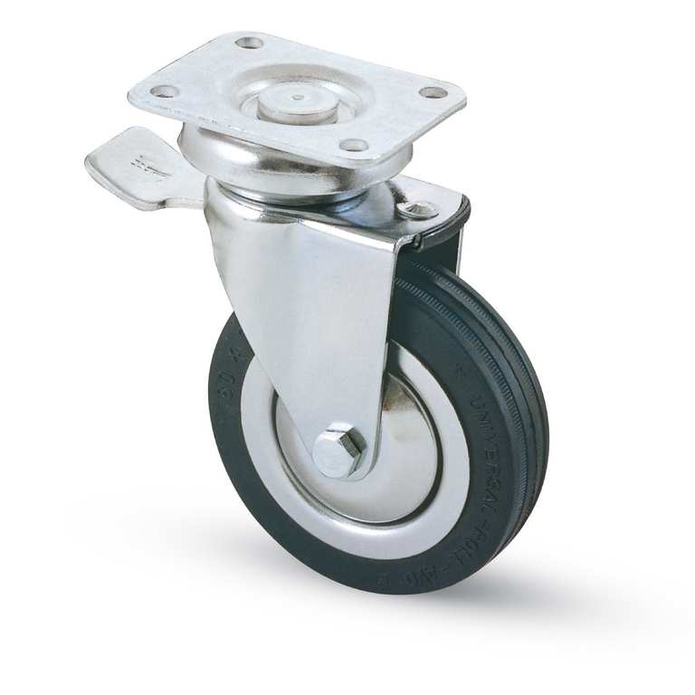 In gomma, supporto in acciaio cromato rotante su corona di sfere, assemblaggio con dado autobloccante, con bloccaggio ruota e piastra.