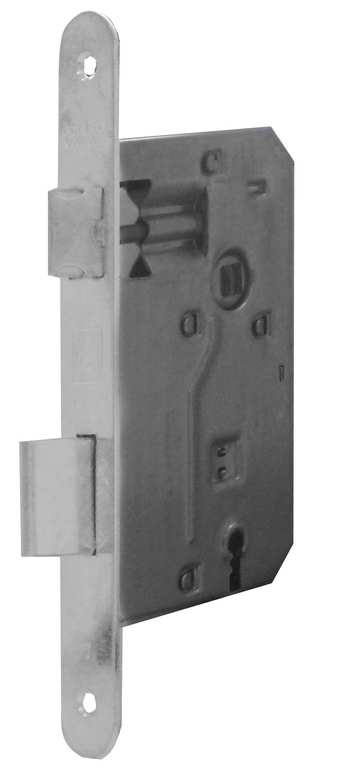 Serratura da infilare, scrocco reversibile, quadro mm. 8, distanza mm. 70, bordo tondo, senza contropiastra.