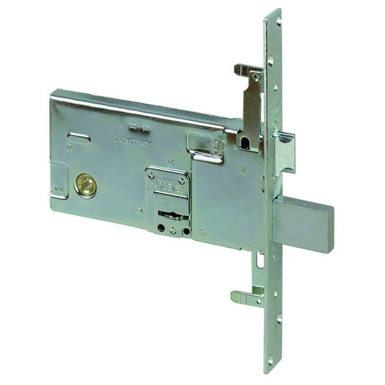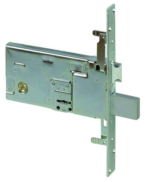 Serratura a doppia mappa da infilare per fasce. 4 mandate e scrocco, 3 punti di chiusura, protezione antitrapano, senza aste, 2 chiavi, zincata, scatola mm. 166x82.