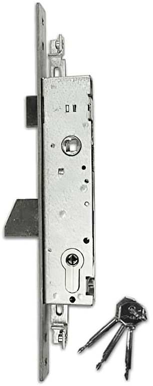 Serratura ambidestra da infilare per montanti, con cilindro e 3 chiavi a spillo. 1 mandata, chiusura triplice, catenaccio e scrocco, frontale in acciaio inox, quadro maniglia, scatole mm. 40/45/50x172.