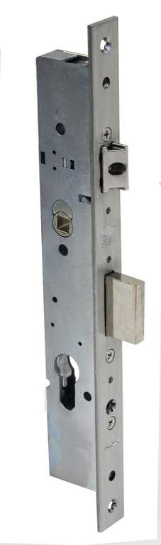 Serratura ambidestra da infilare ad ingranaggi per montanti, predisposta per cilindro europeo. 2 mandate, chiusura triplice, catenaccio e scrocco regolabile, frontale in acciaio inox, quadro maniglia, scatole mm. 40/45/50x247.