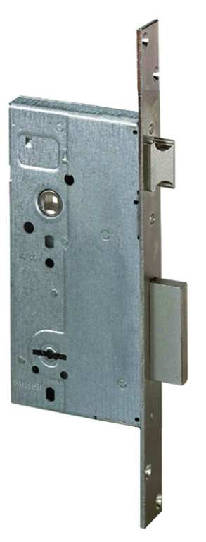 Serratura da infilare a doppia mappa. 2 mandate e scrocco, con contropiastra e copritoppa, 3 chiavi, scatola mm. 76x170.