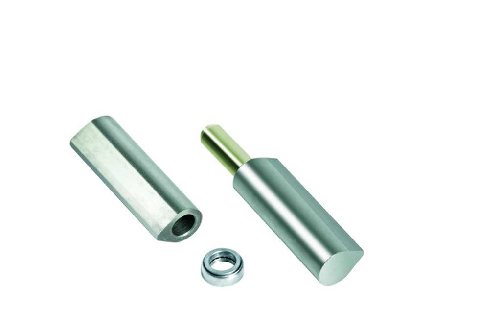 In acciaio, perno rivestito in ottone, con cuscinetto. Per serramenti in acciaio.