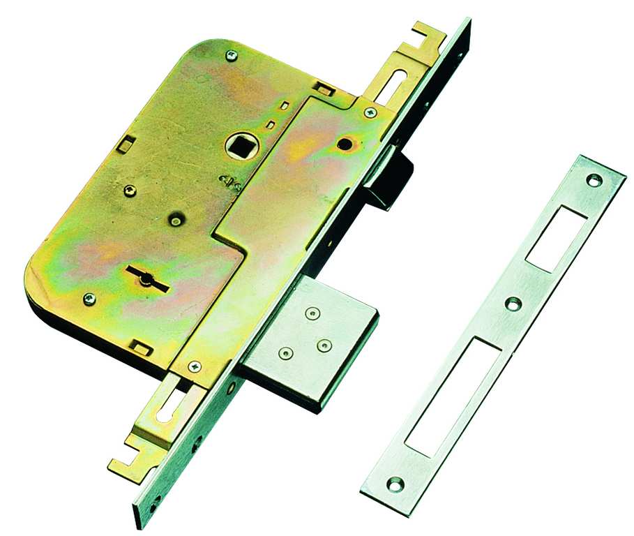 Serratura da infilare a doppia mappa. 4 mandate, chiusura triplice con scrocco comandata sia con chiave che con quadro maniglia, senza aste, 3 chiavi mm. 72, scatola mm. 112x72.