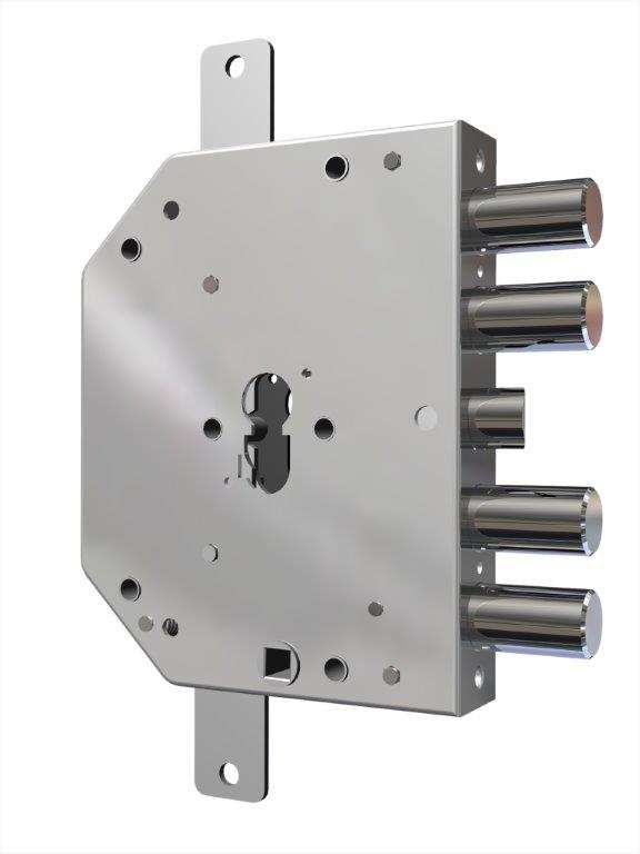 Serratura da applicare. 2 mandate, chiusura triplice con scrocco comandata sia con chiave che con quadro maniglia, 3 punti di chiusura, senza aste, zincata, scatola mm. 130x164. Per cilindro europeo.