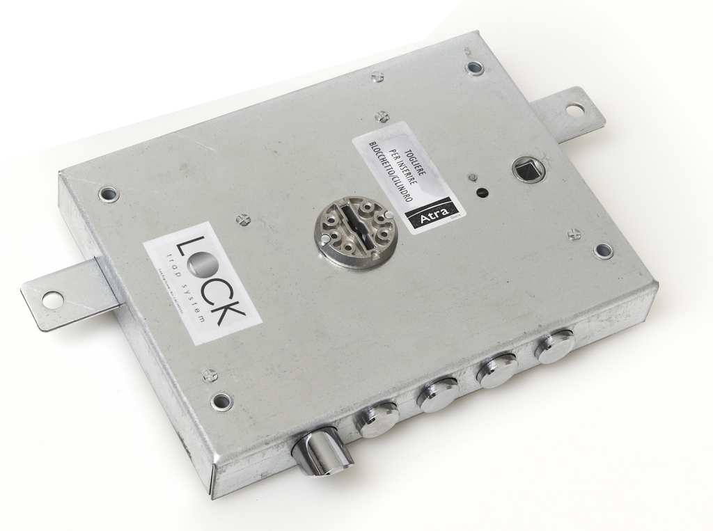 Serratura triplice da applicare a doppia mappa. 4 mandate, scrocco azionato da chiave e quadro maniglia, blocchetto con 3 chiavi mm. 116 + 1 da cantiere, scatola mm. 152x206. Confezionata in busta.