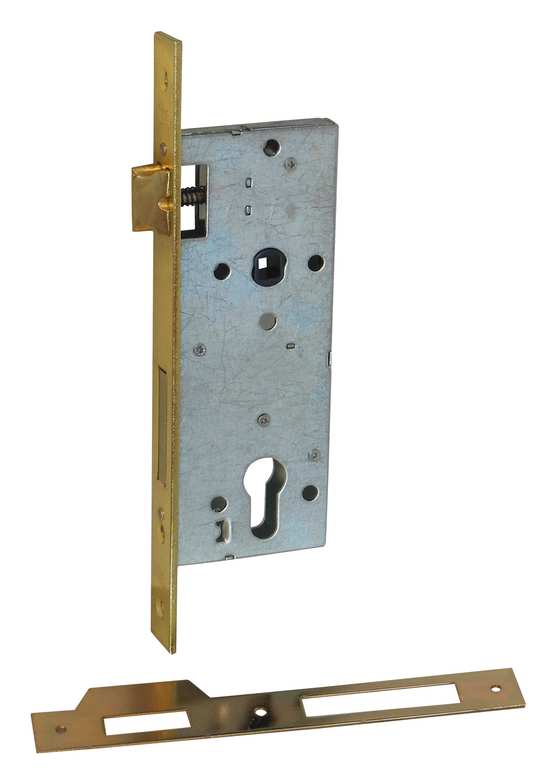 Serratura da infilare. 2 mandate e scrocco, bordo quadro, con contropiastra, quadro mm. 8, 3 chiavi, scatole mm. 50/55/60/65/75x170.
