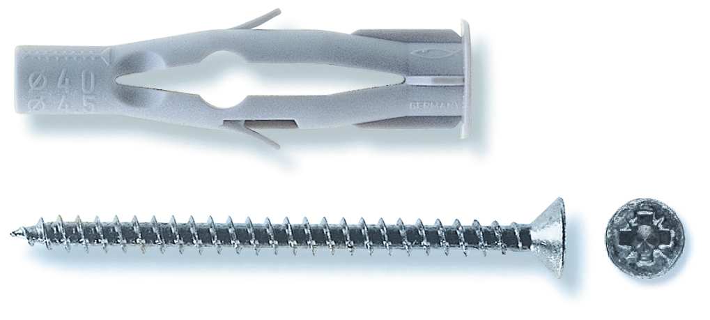 In nylon, con alette antirotazione e vite per legno TSP a croce interamente filettata.