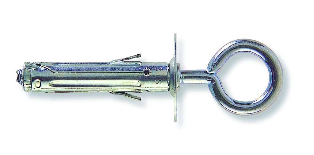 In acciaio, con alette antirotazione, occhiolo chiuso. Per il montaggio su materiali edili.