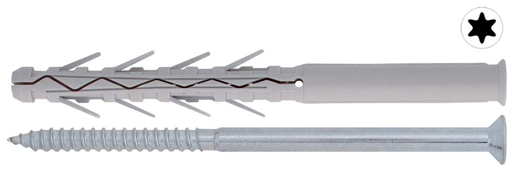 In nylon, con bordo ed alette antirotazione, vite TPS in acciaio zincato bianco impronta torx, tipo prolungato, per fissaggi pesanti.