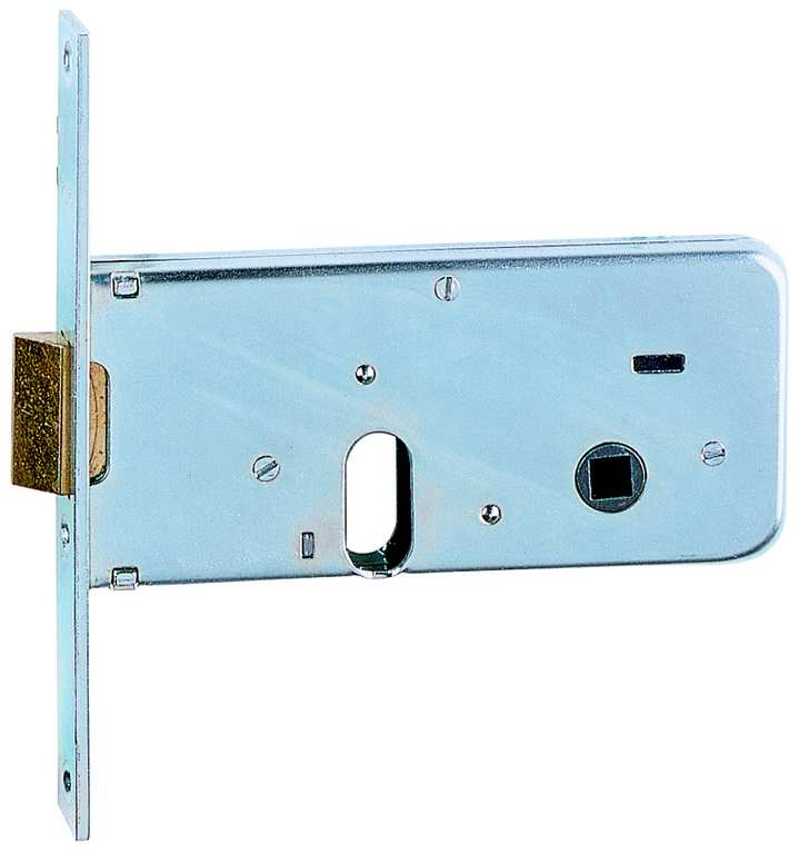 Serratura da infilare per fasce. 2 mandate e scrocco, frontale zincato, zincata, scatola mm. 143x64.