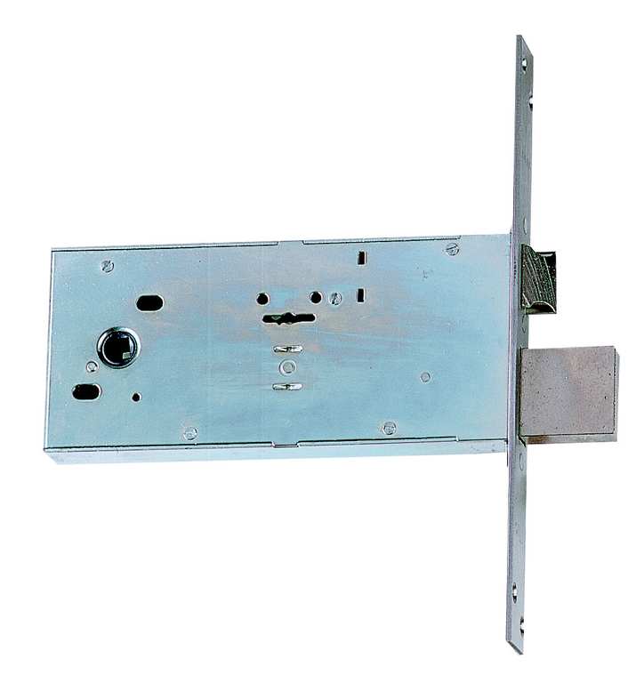 Serratura da infilare a doppia mappa per fascia. 4 mandate, laterale, scrocco separato, reversibile, frontale zincato, 2 chiavi, scatola mm. 186x82.