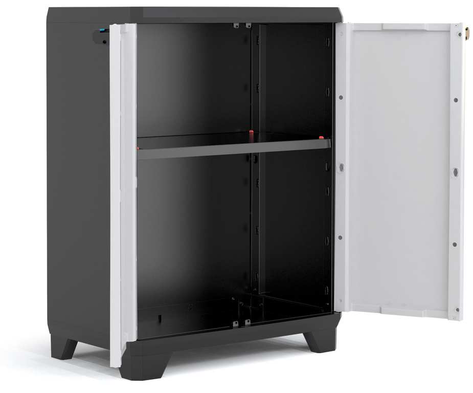 In resina, 1 ripiano regolabile in altezza, portata max per ripiano kg. 15, piedini regolabili, maniglia soft-touch, lucchettabile.