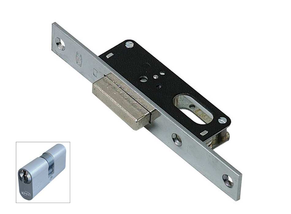Serratura per montanti. 1 mandata, catenaccio, cilindro, 3 chiavi, scatola mm. 26x90.