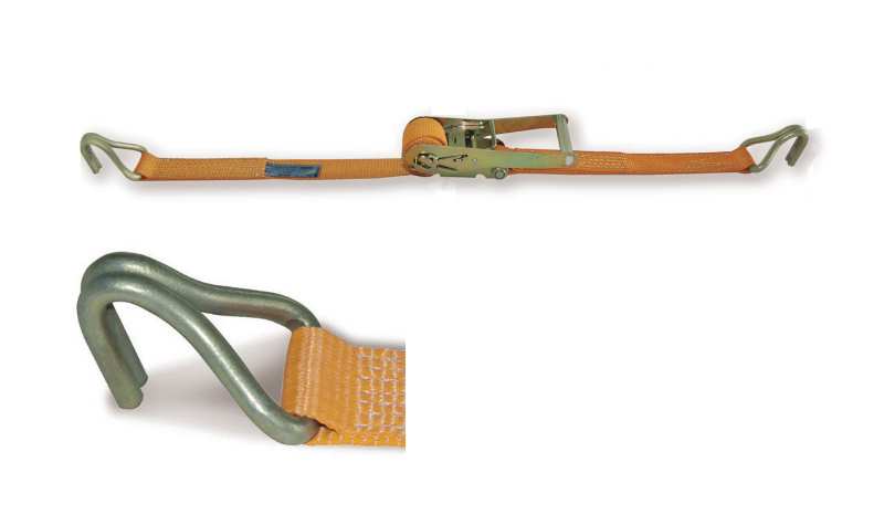 Sistema di ancoraggio a cricchetto (carico di lavoro kg. 2.000), nastro in poliestere ad alta tenacità (PES), ganci ad uncino, fattore di sicurezza 2:1, a norma EN 12195-2, certificato TUV.