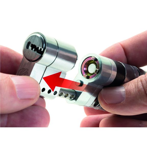 Cilindro cromo satinato modulare di alta sicurezza, doppia funzione frizionato, alta resistenza allo strappo, doppio sistema anti-snap (rottura controllata e barra di rinforzo del corpo in acciaio inox mm. 6), testato UNI EN 1303:2015, sistema di cifratura meccanico a 11 perni attivi, anti-manipolazione, anti-bump, spine anti-trapano, anti-estrazione del rotore, Cam DIN 30° anti-sfondamento, 5 chiavi in ottone nichelato + 1 chiave da cantiere e tessera.Articoli riservati a rivenditori TEAM SECUREMME.