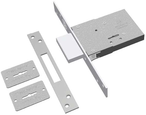 Serratura da infilare a doppia mappa. Zincata, chiusura laterale, contropiastra, 2 piastrine, 2 chiavi brevettate a duplicazione controllata, scatole mm. 80/112/122x73.