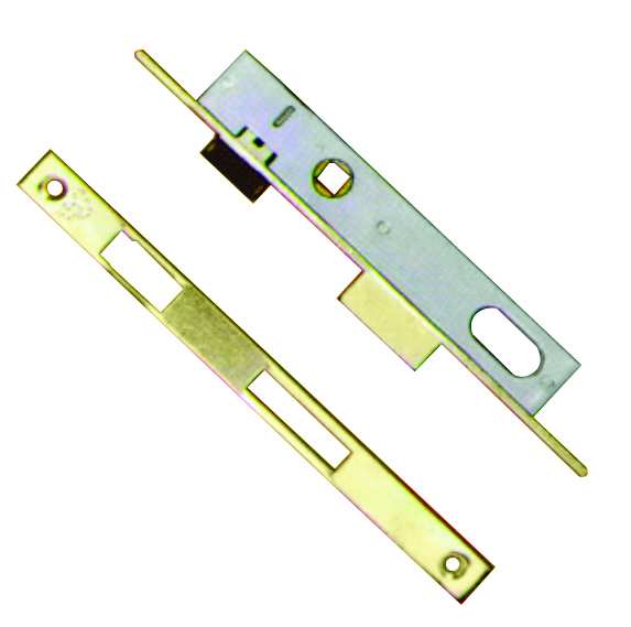 Serratura da infilare per montanti. 1 mandata e scrocco, quadro maniglia, con incontro, scatola mm. 25x150.