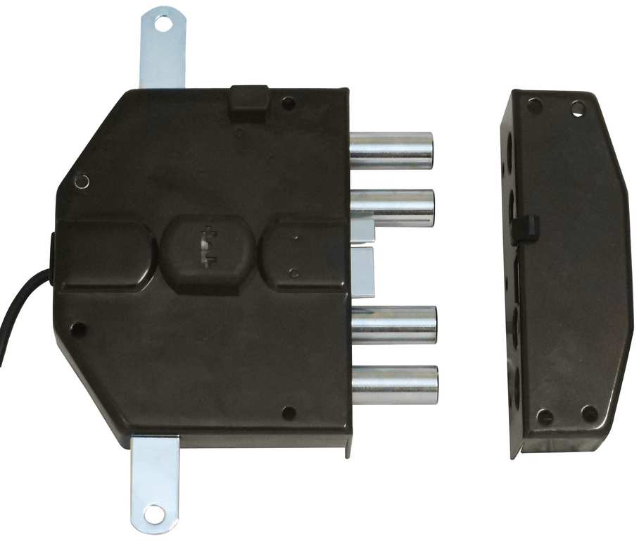 Elettroserratura con cilindro a pompa. Scrocco, 3 punti di chiusura, 3 chiavi. Tensione 8/12 V ca.