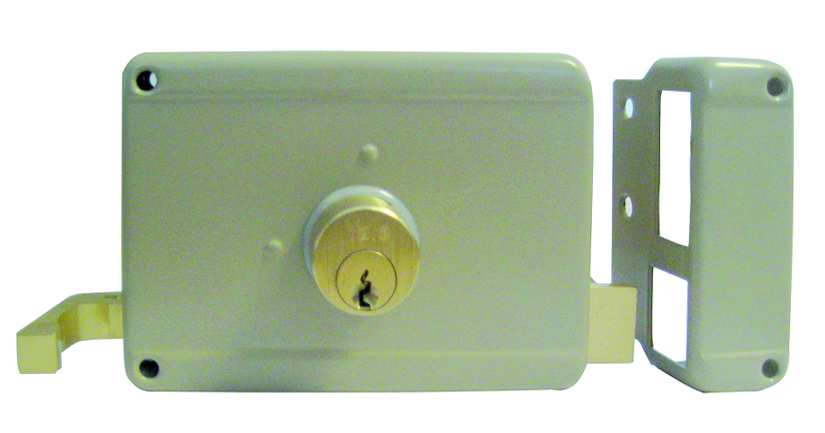 Serratura da applicare. 2 mandate e scrocco, cilindro esterno fisso e cilindro interno, 3 chiavi.