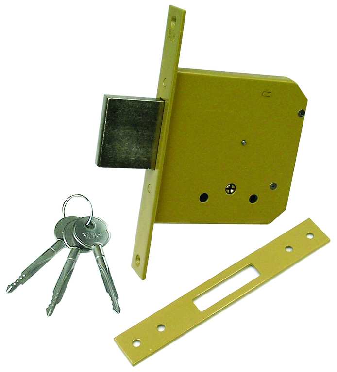 Serratura da infilare. 4 mandate, 3 chiavi a spillo, scatole mm. 99,5/109,5x110.